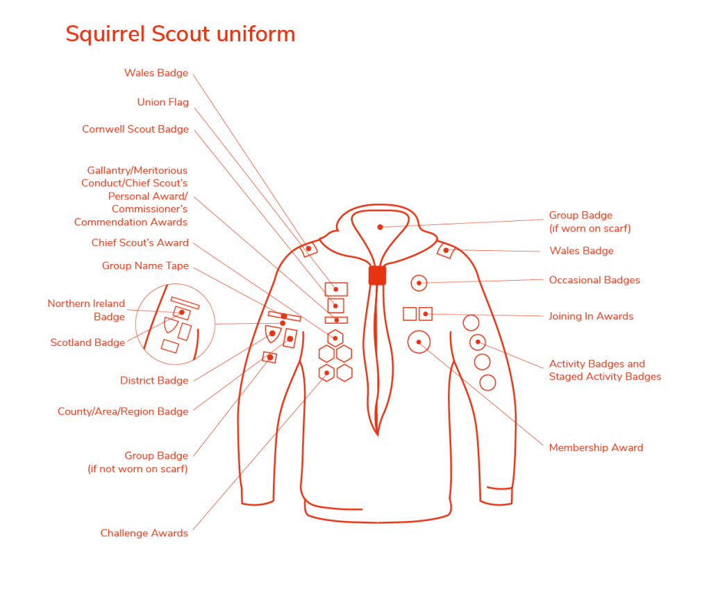 Our Squirrels will take part in lots of activities that go towards various โactivityโ and โchallengeโ badges. Please sew or stick them onto the Squirrelโs jumper โ here is a diagram showing where they should go: